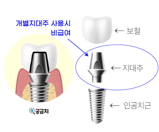 만약에 임플란트 시술 전 개별지대주라는 것을 사용하게되면 이 부분은 재료대만 비급여이다. 기본적으로는 임플란트 회사에서 만든 기성지대주라는것이 보험 비용에 포함되어 있다. 임플란트가 있고 지대주가 있고 그 위에 보철물이 올라가는 구조이다.