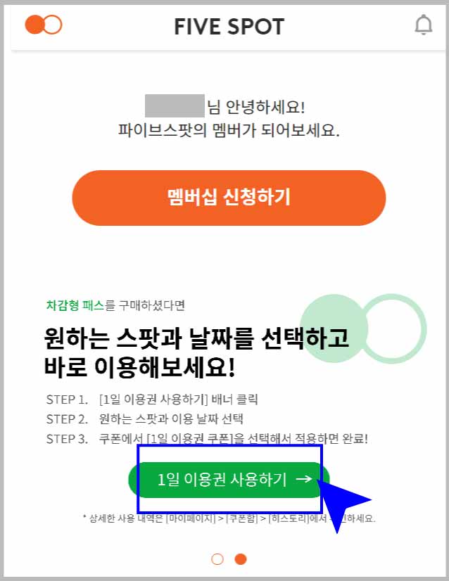 1. 회원가입 후 (추천인 코드 꼭 넣고 가입해야 당장 안 써도 나중에 정기권 결제할 때 30%할인쿠폰을 쓸 수 있다) 아래 링크로 접속한 후 【1일 이용권 사용하기】버튼을 누른다.