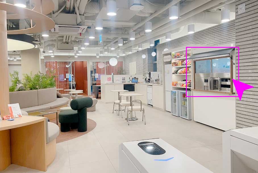 여기서 디스플레이가 장착된 자동 음료 판매기계에서 파이브스팟 멤버는 커피를 무료로 마실 수 있다. 옆에 먹음직스러운 과자들은 다 유료이다. 이것도 셀프 결제하는데 세상 참 편해졌다는 생각이 든다. ㅋ