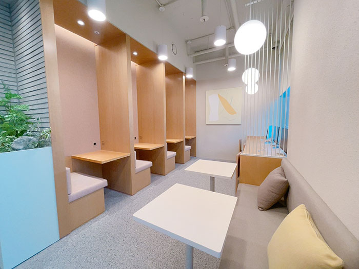 파이브스팟은 지점마다 좌석 배치가 다르다. 패스트파이브의 라운지를 이용하는 것인데 어느 지점이건 거의 다 카페 같은 분위기이다. 칸막이가 있는 자리도 있고 없는 자리가 다양하게 분포되어있다.