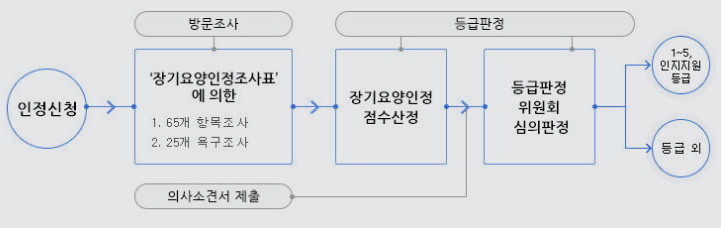 총 65개 항목에 대한 심사를 거쳐 6가지 등급으로 장기요양보험대상으로 구분한다.