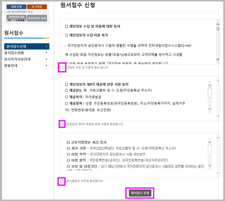 개인정보 동의 항목에 모두 체크 후 【원서접수신청】클릭