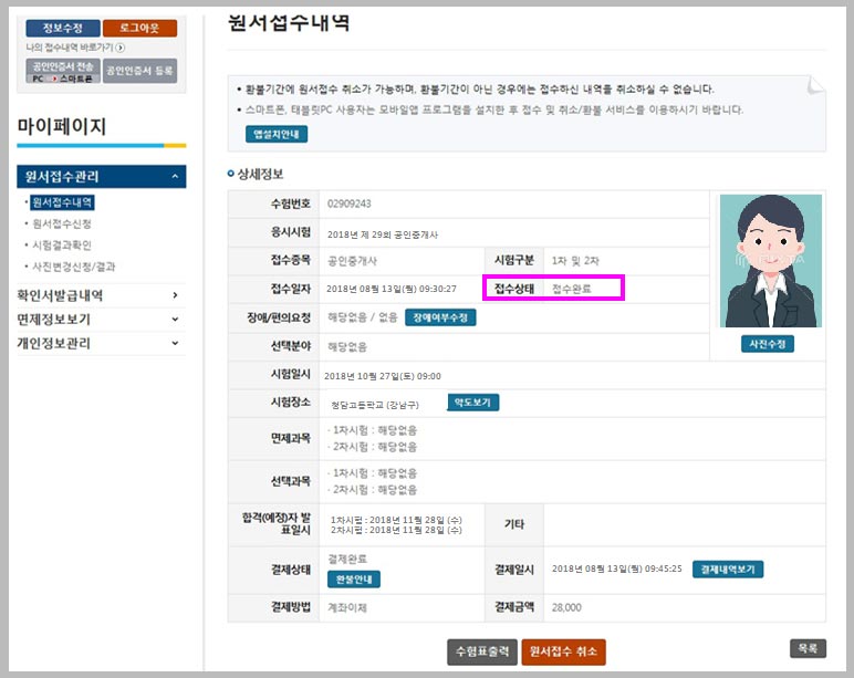 입금 완료하면 원서접수내역에서 【접수완료】라고 뜸.