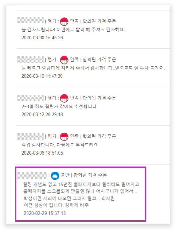 의뢰 전 긍정적후기와 부정적 후기의 비율, 또 부정적 후기는 어떤 내용이 주로 겹치는지를 살펴보는 건 좋은 밑작업이다.