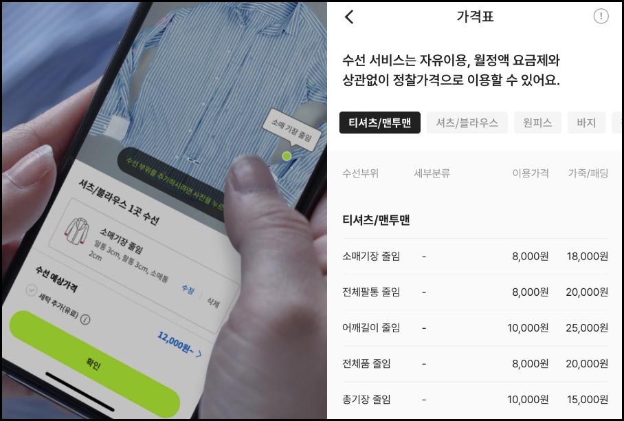 후크달기부터 고무줄 수선, 기장 수선은 물론 덧댐 수선과 지퍼 교체까지 해주는 세탁특공대의 옷수선 서비스 가격이다.
