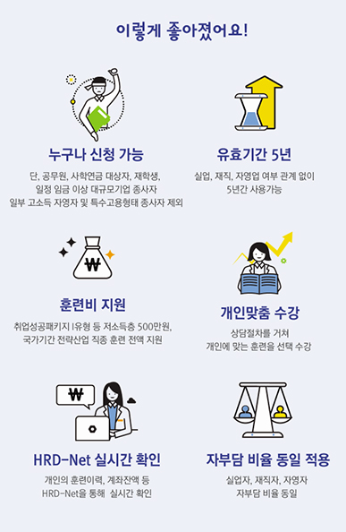 실업·재직·자영업 여부에 관계없이 국민내일배움카드를 발급하고 일정 금액의 훈련비를 지원함으로써 직업능력개발 훈련에 참여할 수 있도록 하며, 직업능력개발 훈련이력을 종합적으로 관리하는 제도로 기존 실업자‧재직자로 분리‧운영되던 내일배움카드를 국민내일배움카드로 통합('20.1.1.)한 것이다.