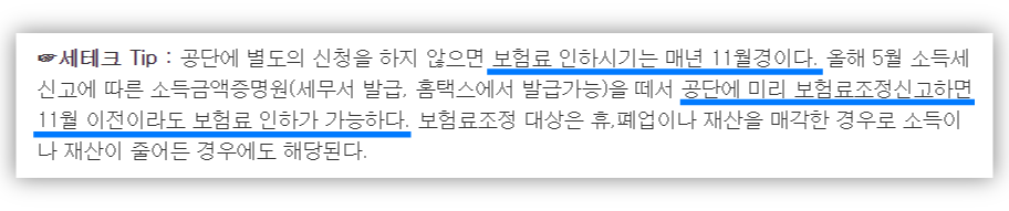 위의 [세테크tip]에 나온대로 매년 공단에서 공지하는 보험료 인하시기인 11월까지 기다리지 말고, 재산 매각이나 소득감소시 그 달에 바로바로 공단에 전화해서 최대한 경감받을 수 있도록 해야겠다.