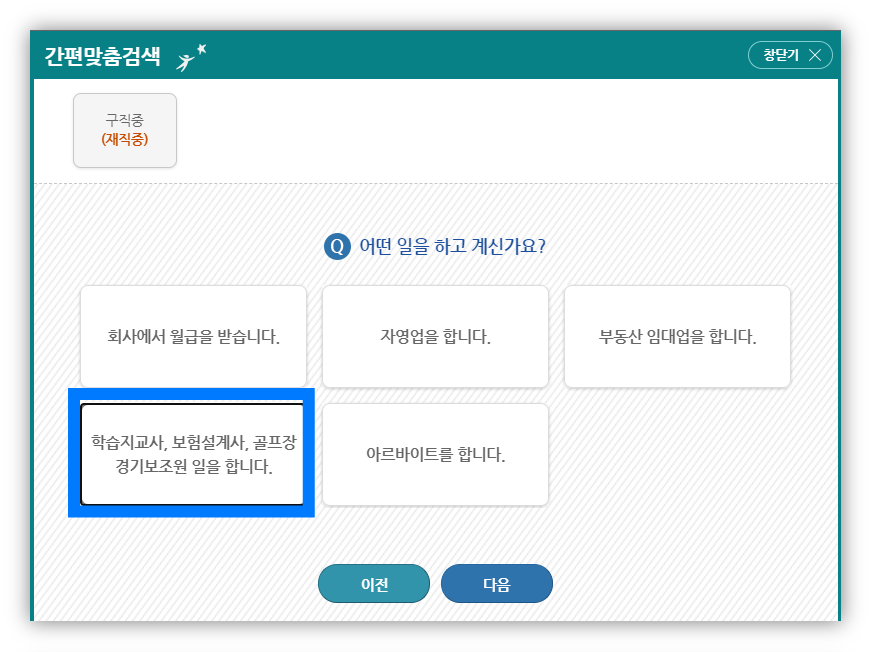 회사월급받는 것도 아니고, 자영업도 아니고, 부동산임대업도 아니고 그냥 알바도 아니라서 일단 제일 계약직스러운 일로 클릭했다.