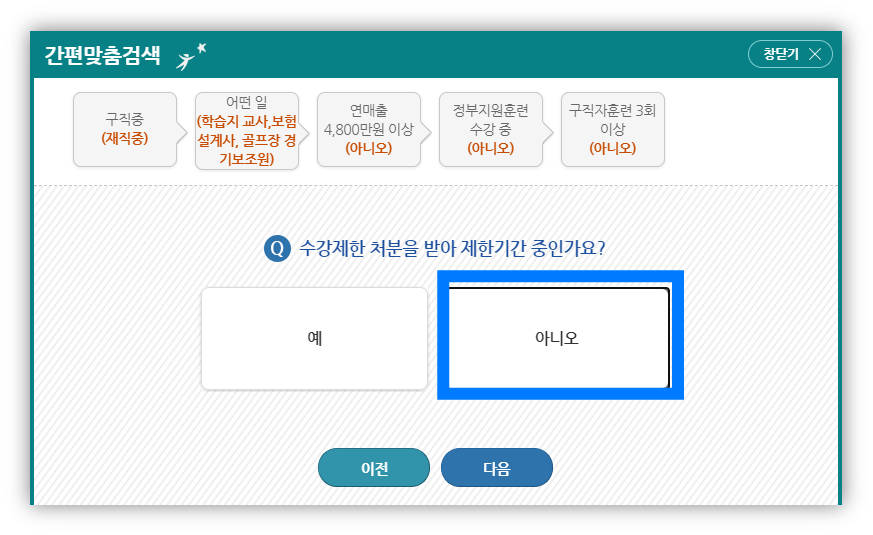 이상 관련 질문에 '예'를 클릭하면