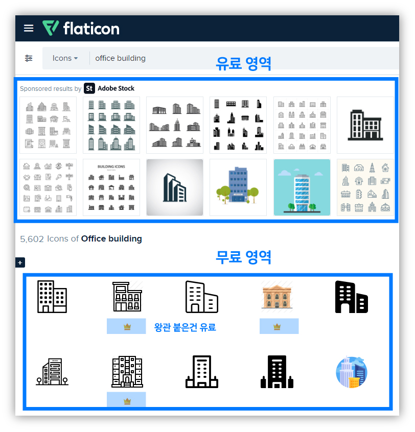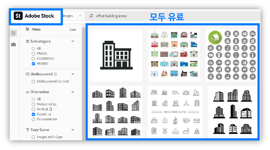 상단에 adobe stock의 유료 아이콘이 뜨고 하단에 무료 아이콘과 유료 아이콘이 섞여서 뜬다.