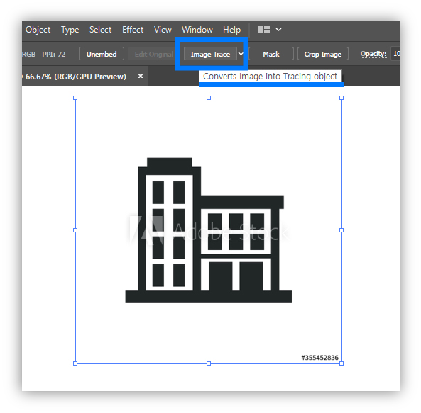붙여넣기 한 이미지 선택해놓은 상태에서 메뉴바 상단에 [이미지 트레이스] 버튼 클릭.