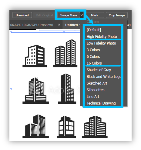이 기능이 이미지를 벡터화 시켜주는 버튼이다. 일러스트레이터 화면 최상단 메뉴바 밑에 있는데 대지에서 이미지를 선택한 상태여야 이 버튼도 활성화되어 나타난다.