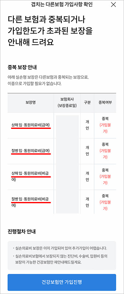 서론에 말씀드렸듯이 저는 이미 가입한 실손 보험이 있어서 '다른 보험과 중복된다'고 나오네요. 이런 경우에는 기존 보험을 해지한 뒤에 가입 신청을 해야 일이 수월하게 진행됩니다.