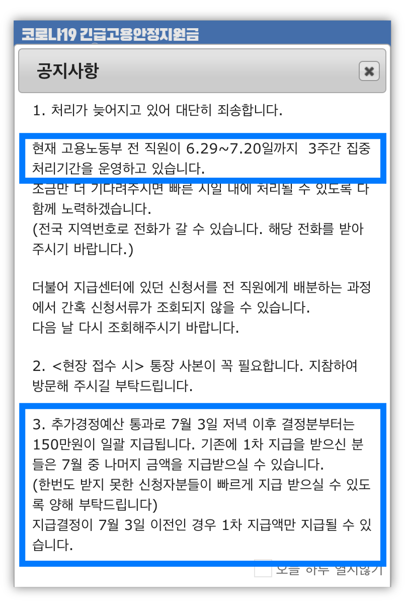 1차 입금을 못 받은 사람도 많으니 7/3이후 지급결정이 완료된 건은 모두 150만원을 한 번에 지급해준다고 한다.
