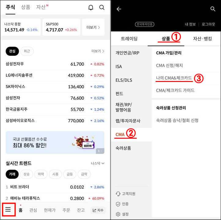 ③ 나의 CMA&체크카드 순서대로 들어가주세요.
