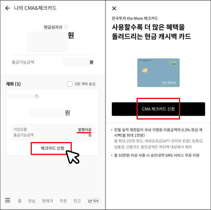 다음 화면에서 한투 CMA 체크카드 혜택을 확인하시고 또 CMA 체크카드 신청 버튼을 눌러주세요.