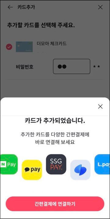 내 명의로 발급된 카드이기에 페이북 앱에 들어가시면 아래 화면처럼 한투 더모아 체크카드를 '추가'만 하시면 되거든요.