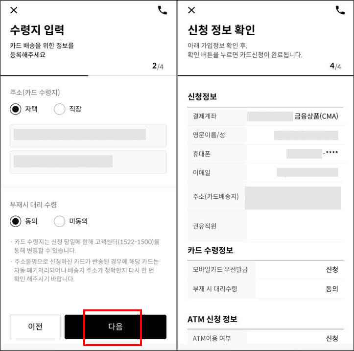 한투 CMA 체크카드는 배달기사님이 직접 배달해주시더라구요. 자택이든 직장이든 편하신 곳으로 입력해주세요.