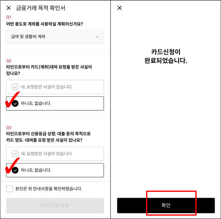 카드 양도 요청 받은 사실이 있냐는 질문에도 '아니오'를 누르셔야 최종적으로 체크카드를 신청하실 수 있습니다.