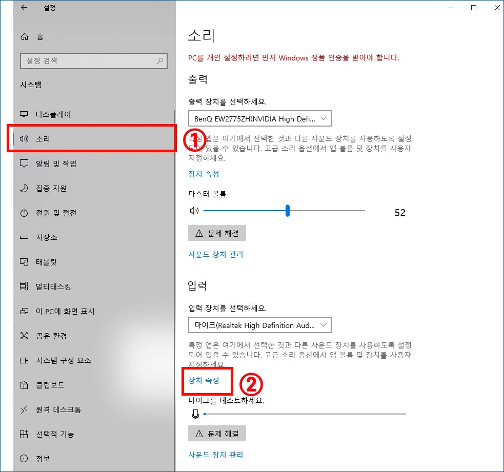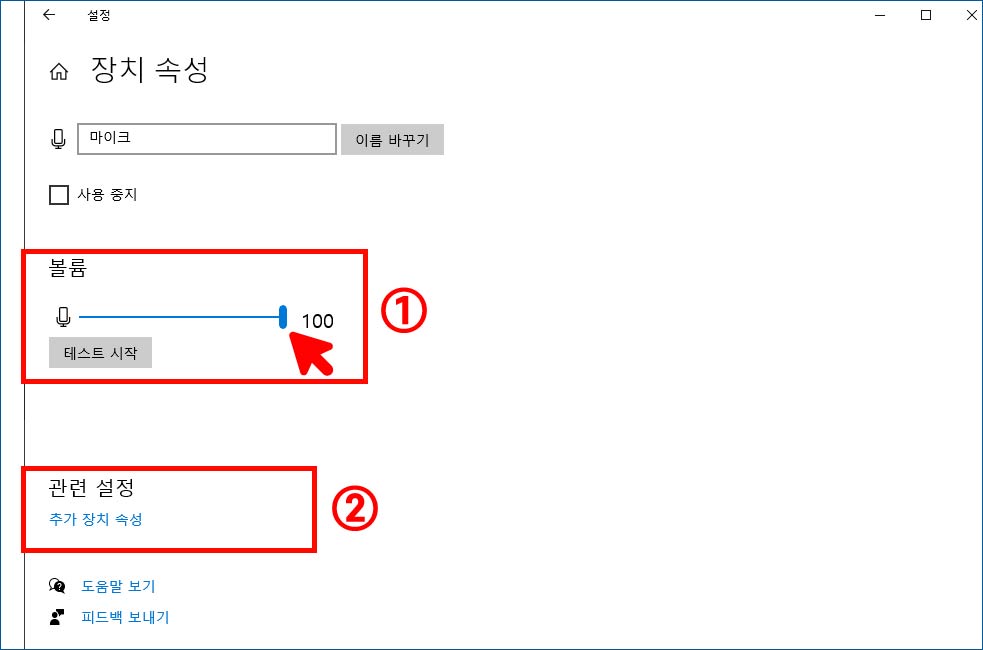 화면에서는 마이크 부분의 '장치 속성'을 눌러주세요.