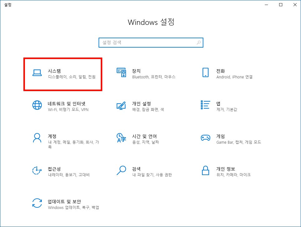 window 설정 창에 들어오셨으면 여기서 맨 앞에 있는 [시스템]을 눌러주세요.