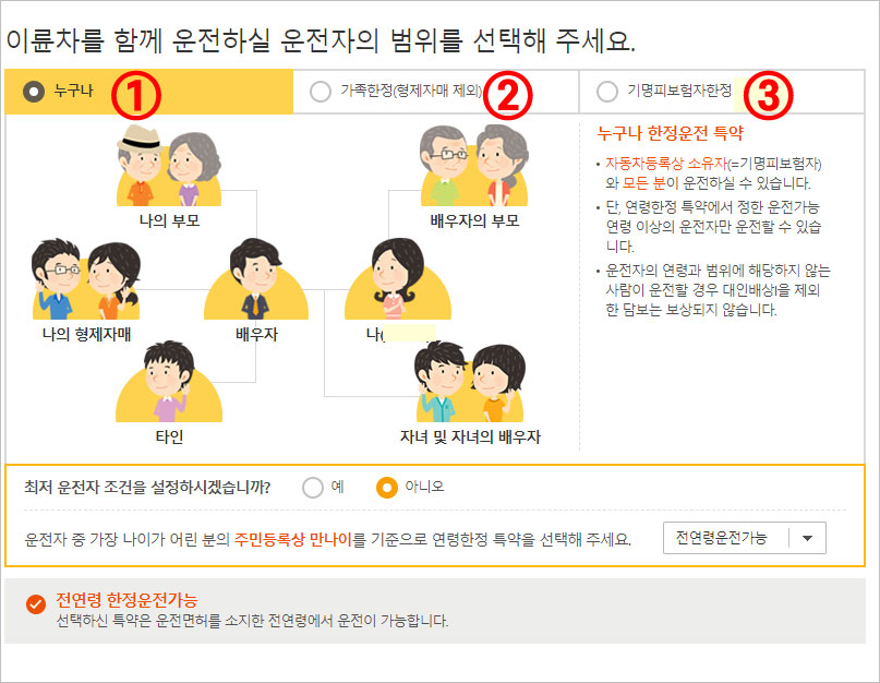 인원수도 1인으로 할 때와 온 가족, 혹은 누구나 다 운행 가능하다고 선택하면 보험료가 엄청나게 뛰어버려요.