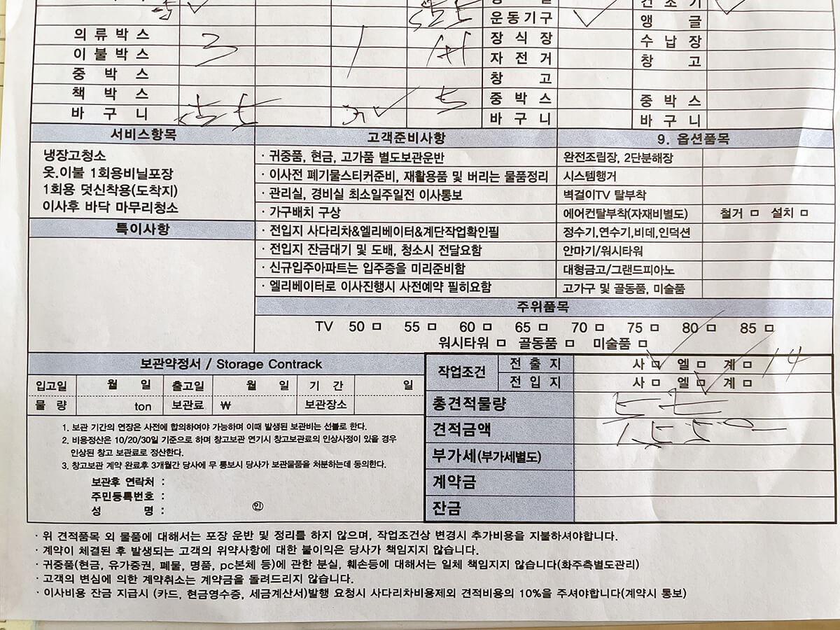 일단 오시면 눈앞에 있는 공간부터 둘러보십니다. 견적내는 방식은 3곳 모두 동일했어요. 이사 견적서를 가지고 다니시면서 이 집에있는 품목에 일일이 다 체크를 합니다.
