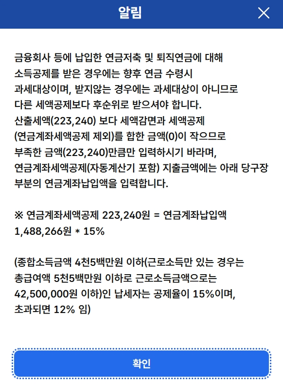 간단하게 말하면 위의 팝업은 제가 다른데서 이런저런 공제를 쓸만큼 써서 연금계좌 공제는 최대금액이 아닌 저기 나온 223,240만원만 공제받을만큼만 입력하라는 소리였습니다.