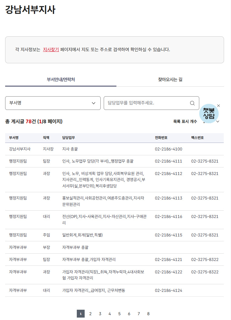 그럼 건보 공단 대표번호가 아닌 지사의 각 담당자 연락처를 찾으실 수 있어요.