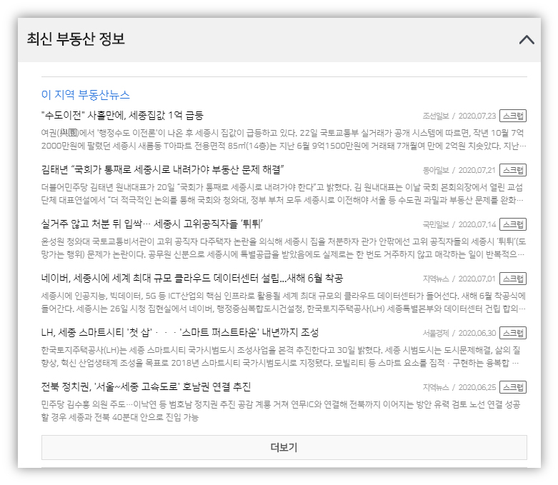 해당 토지 지역 부동산 뉴스를 따로 찾아보지 않아도 업데이트가 바로바로 된다. 한데 모은 뉴스를 제목만 봐도 어떤 호재가 있는지 살펴볼 수 있는 것이 장점이다.