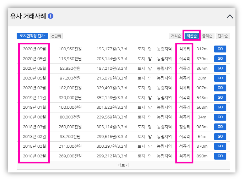 이것도 참 유용한 기능이다. 주변 토지의 최근 실거래가를 알아볼 수 있다. 정확한 지번은 나오지 않지만 관심 지역 시세를 확인해볼 수 있다는게 큰 장점이다.