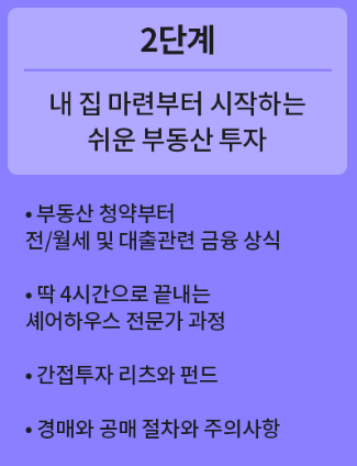부동산 투자에 대한 기본적인 이해와 청약, 경공매, 재건축, 세무분야까지 부동산의 기초 용어와 지식을 갖출 수 있게 된다. 이론뿐만 아니라 개인의 성향과 재무 상황에 맞춰 부동산 재테크 방법을 설계하는 것까지 배우게 된다.