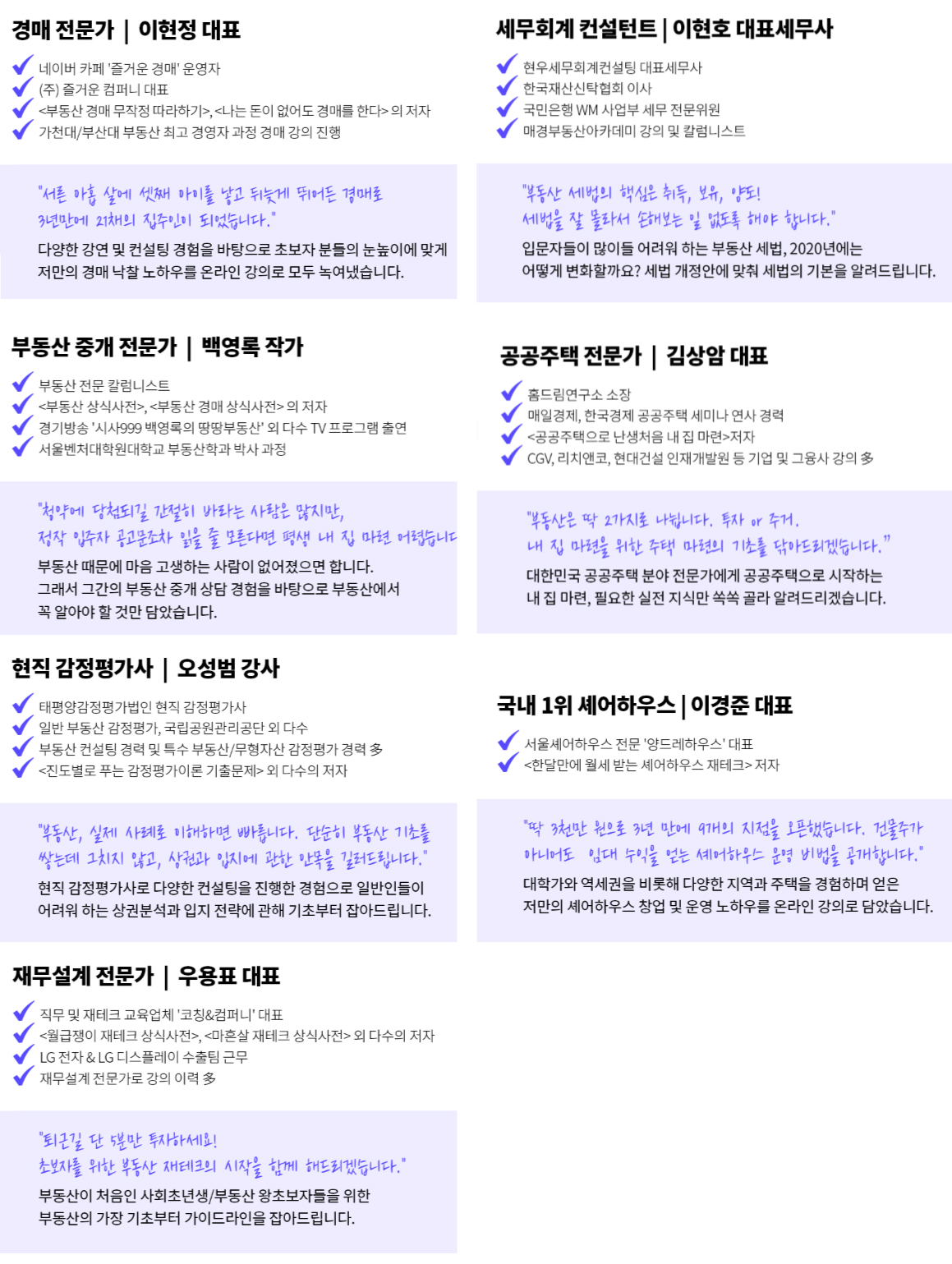 부동산 투자에 빠삭한 현직 전문가들 (감정평가사, 세무사, 공인중개사) 에게 직접 실무를 배우게 되어 특정 정보에 치우치지 않고 나만의 부동산 보는 안목을 갖게 된다.