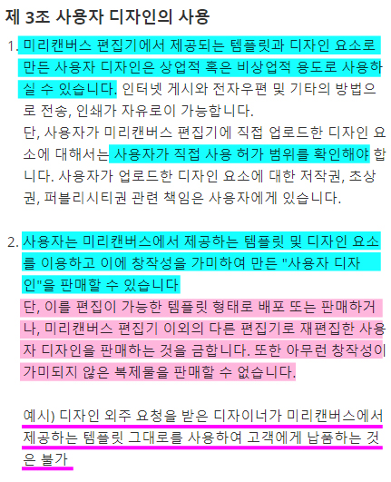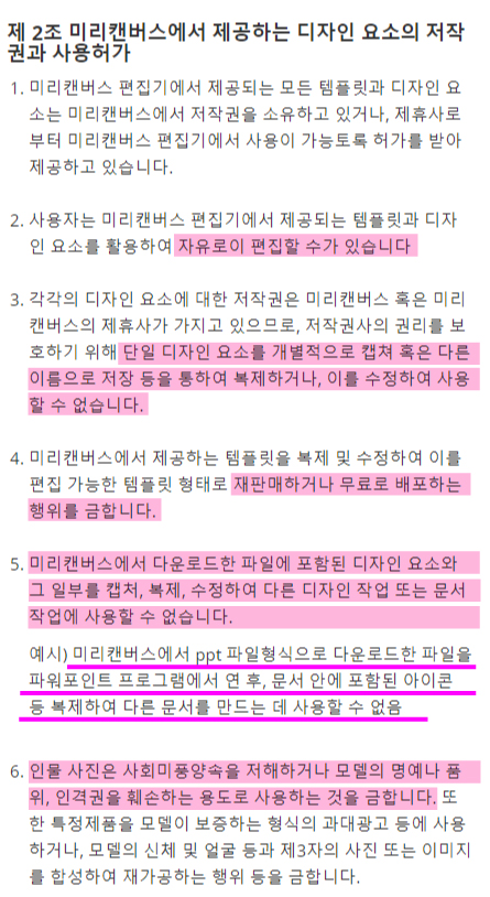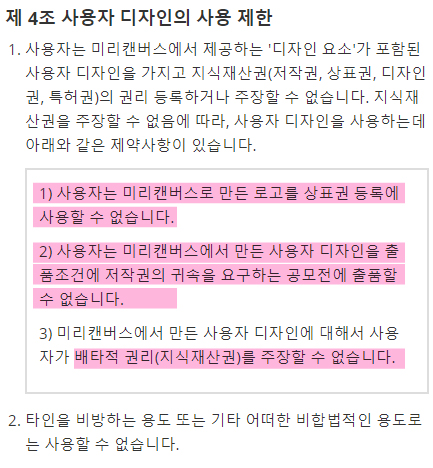 하지만 나쁜 의도로 사용하는 사람들이 있게 마련이니 상업적으로 이용 가능한 것에 일부 제한을 뒀는데 이 조항들이 무엇인지 알아보고 미리캔버스를 마음껏 이용하자!