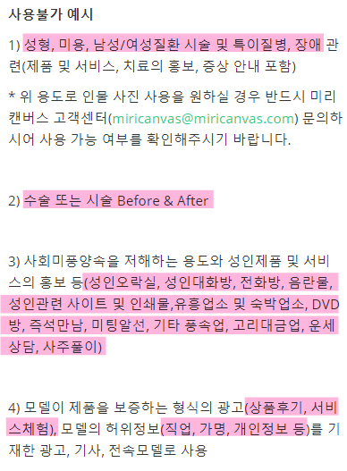 사회미풍양속 저해하는 용도(성형, 특이질병, 성인오락실 등)나 제품 보증 광고 등에 사진 사용 불가