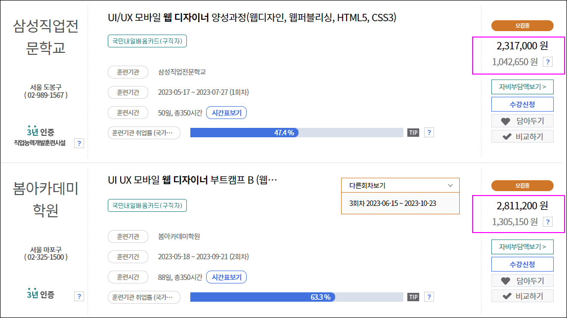 이건 내일배움카드 수업이 아닌 일반 수업을 알아봤을 때 그렇게도 볼만하다.