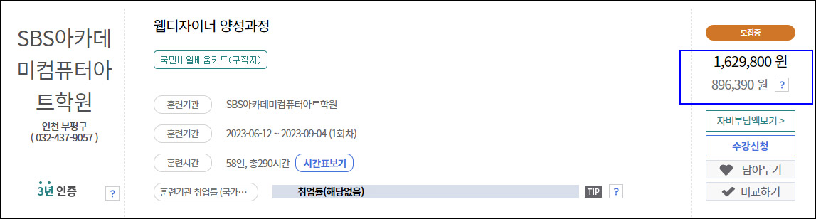 국비지원률은 다른 곳과 다 비슷비슷하거나 SBS 아카데미 수강료가 더 저렴하게 느껴지기도 한다.